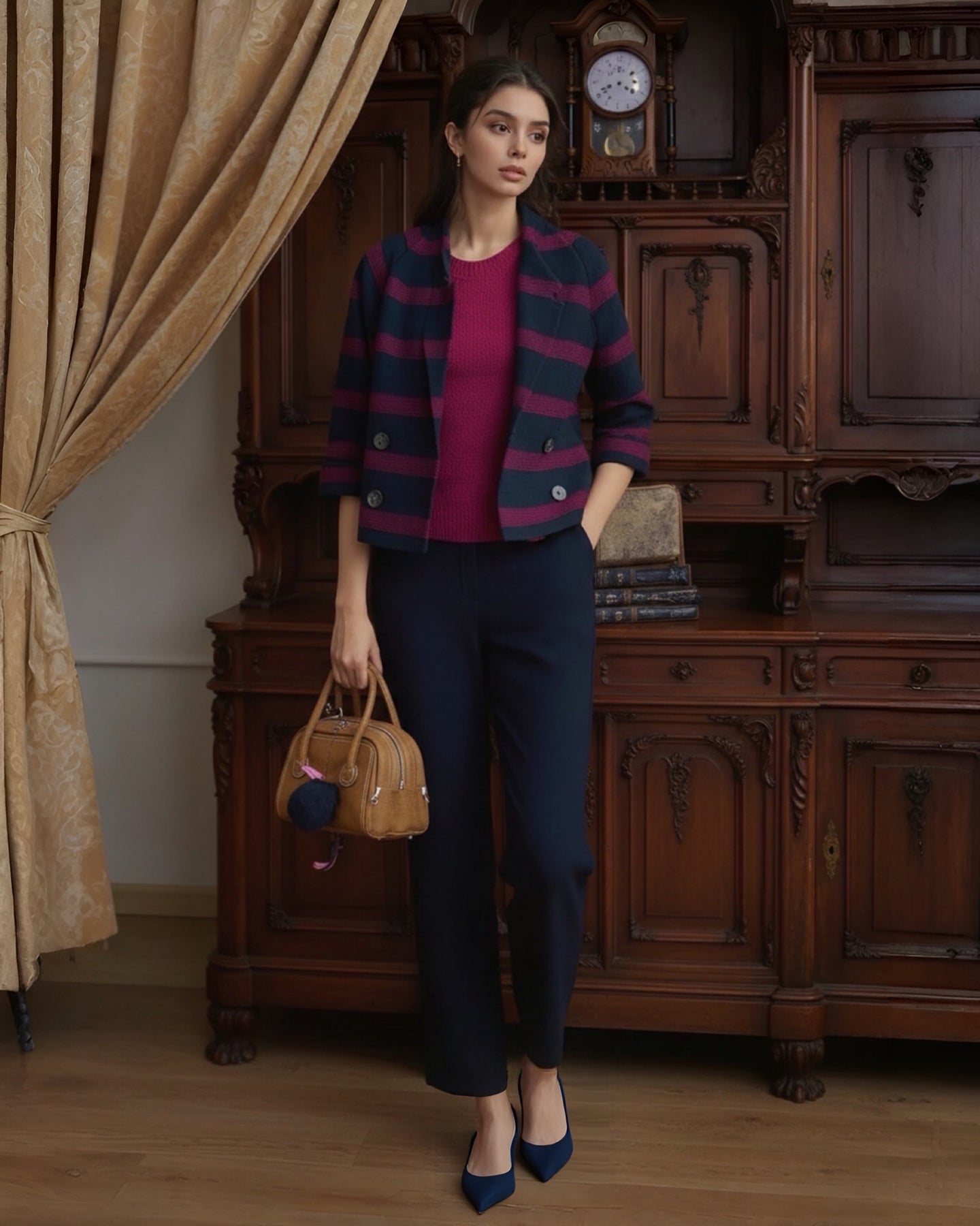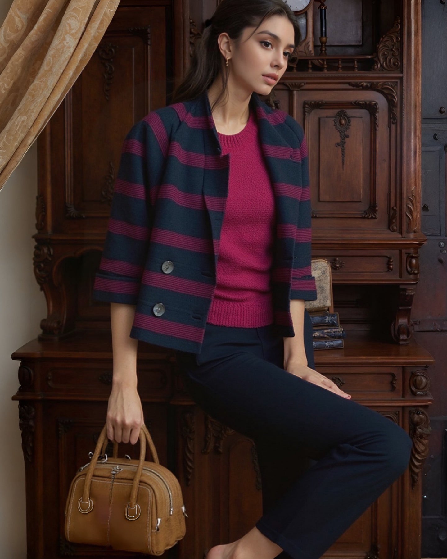 The Francis Striped Jacket is modern elegance done effortlessly. This cropped tweed jacket blends classic tailoring with a contemporary edge, featuring a navy blue and burgundy horizontal stripe pattern that feels timeless yet fresh.