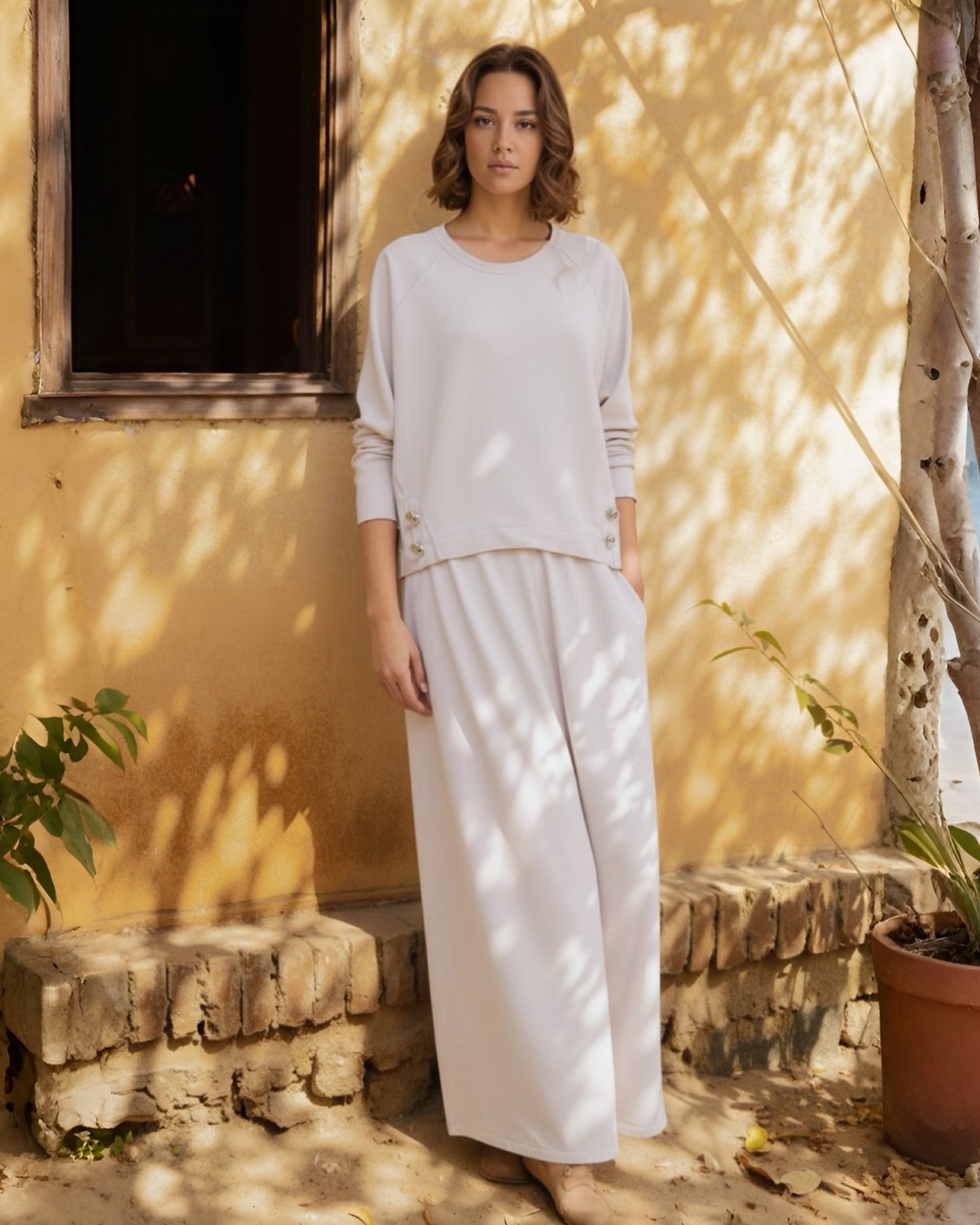 Crafted from soft, lightweight scuba fabric, this two-piece ensemble blends comfort with modern sophistication. The sweatshirt features gold button details at the hem and cuffs, adding a refined touch, while the elastic waistband and wide-leg pants ensure a relaxed yet flattering silhouette.