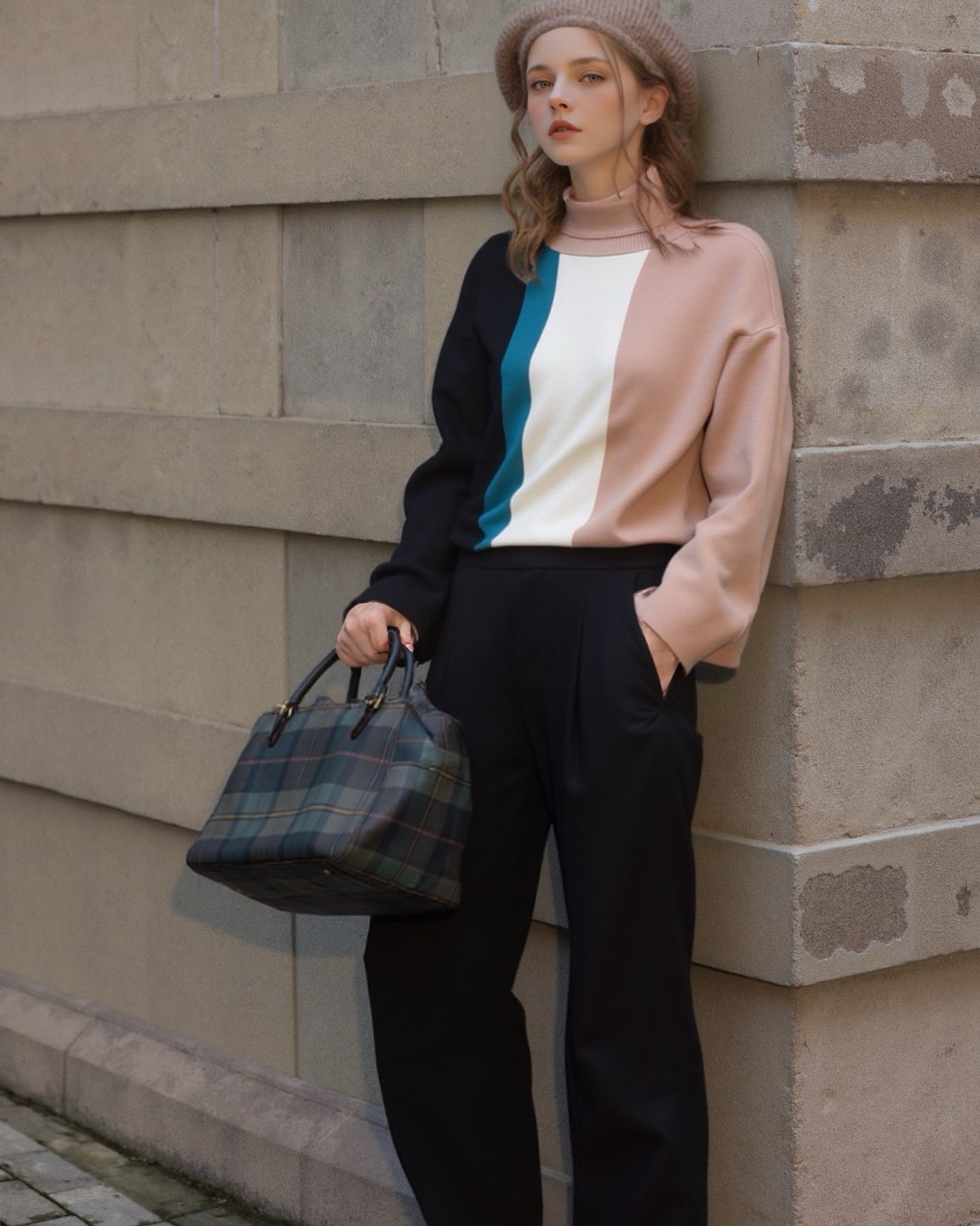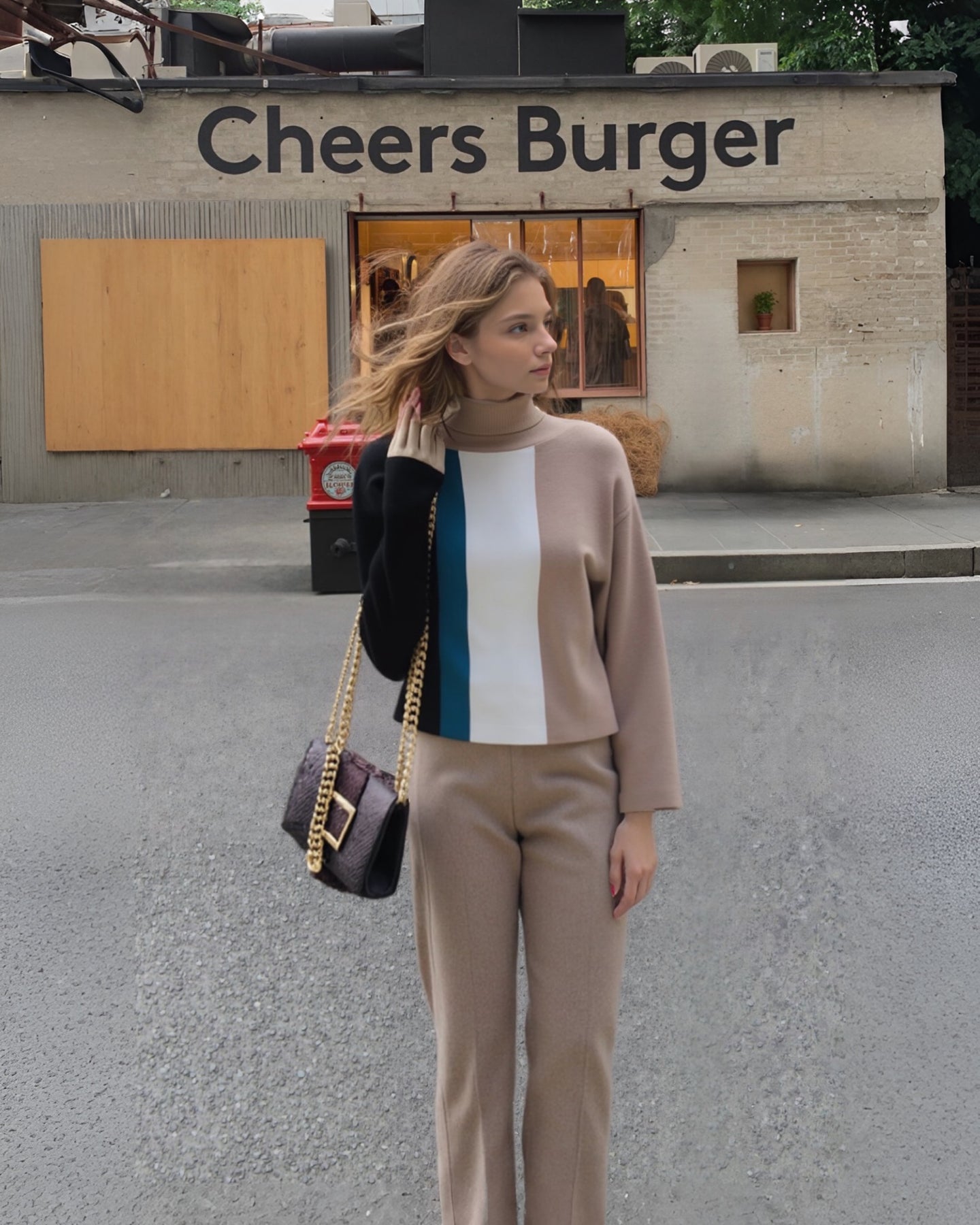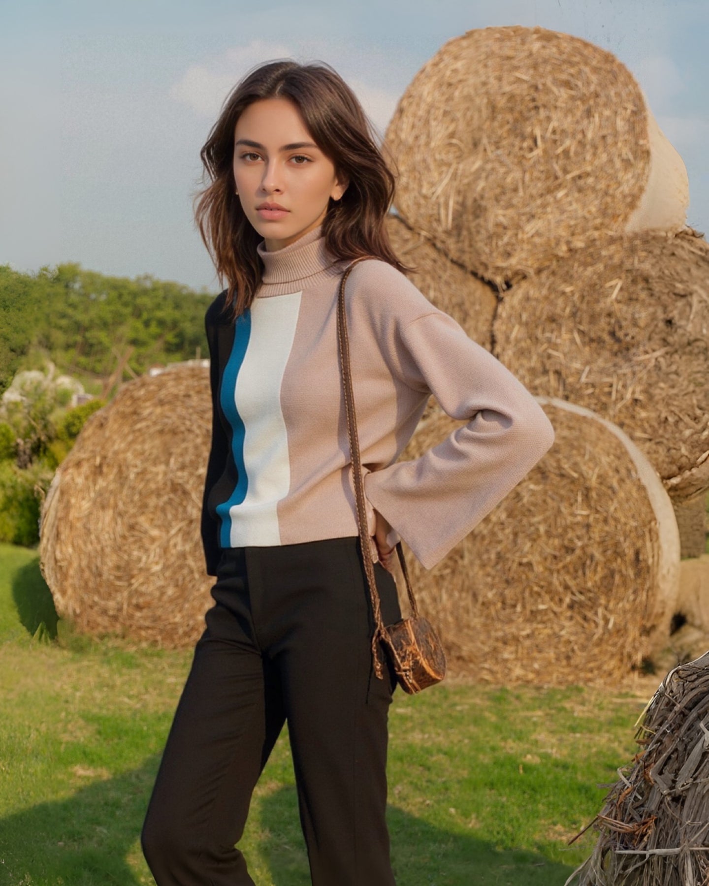 Crafted from a soft, cozy knit, it features a high turtleneck, long bell sleeves, and a striking color-block design in teal, beige, and black, creating a sleek and flattering silhouette. The relaxed yet refined fit makes it perfect for any setting, from casual brunches to elegant evenings out.