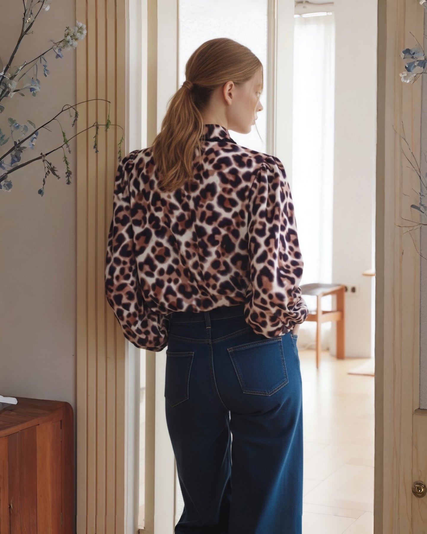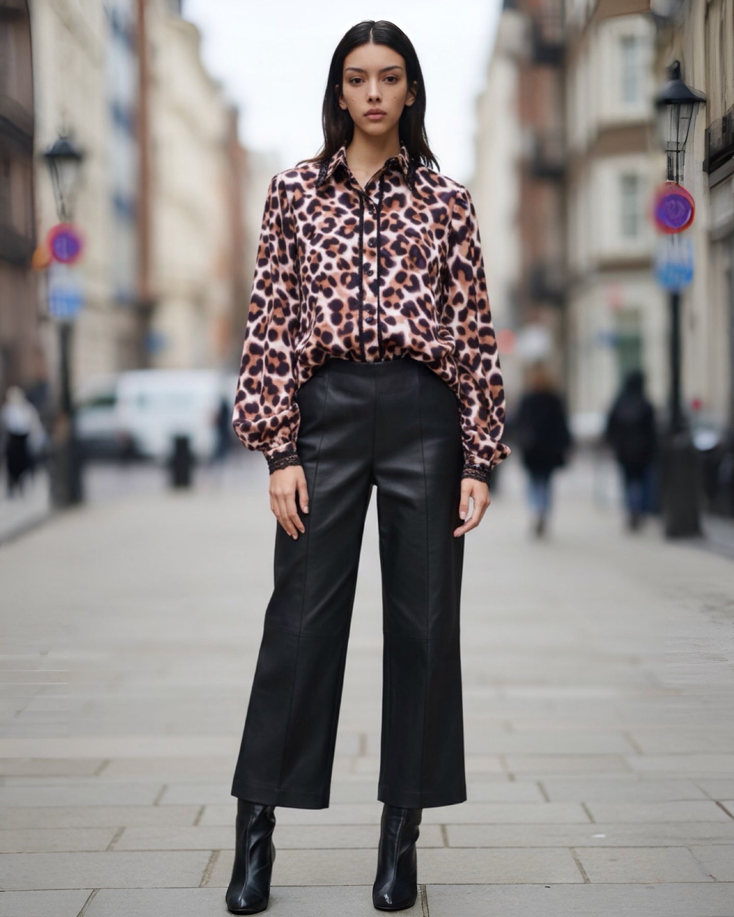 Wildly chic with an air of sophistication — the Sahara Top captures attention with its bold leopard print and elegant silhouette. Crafted from soft crepe fabric, it features puffed long sleeves, button-down front, and a delicate lace trim along the placket that adds a subtle feminine touch.