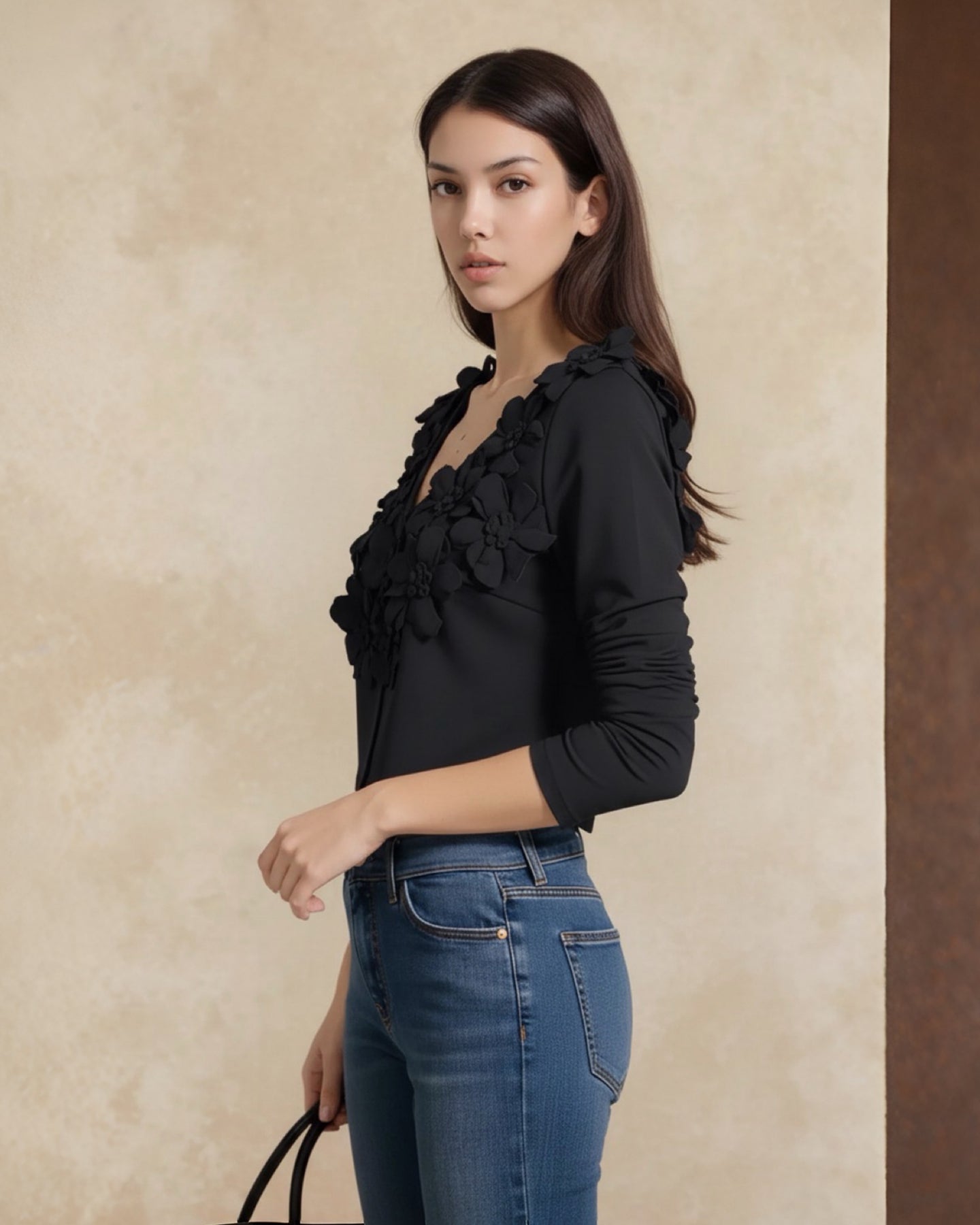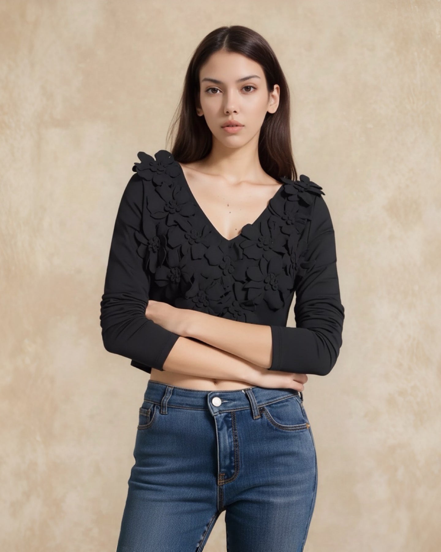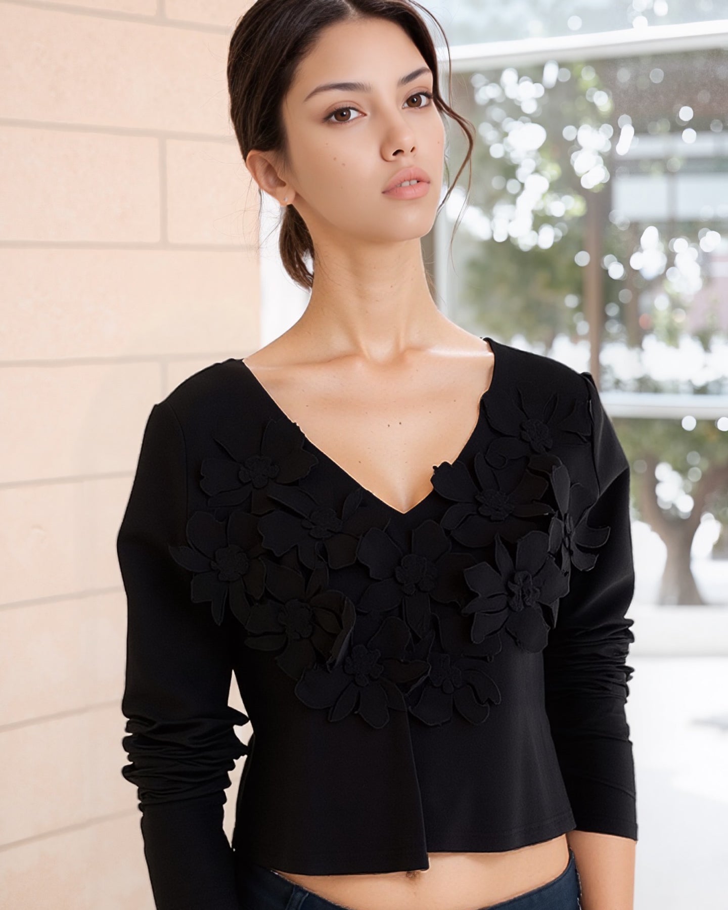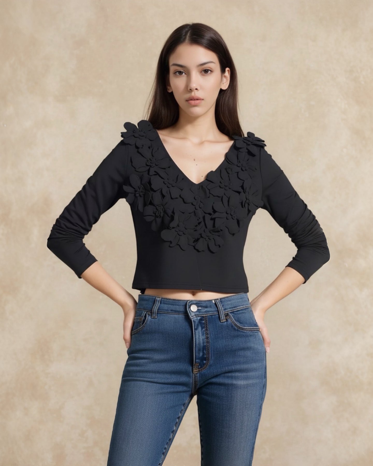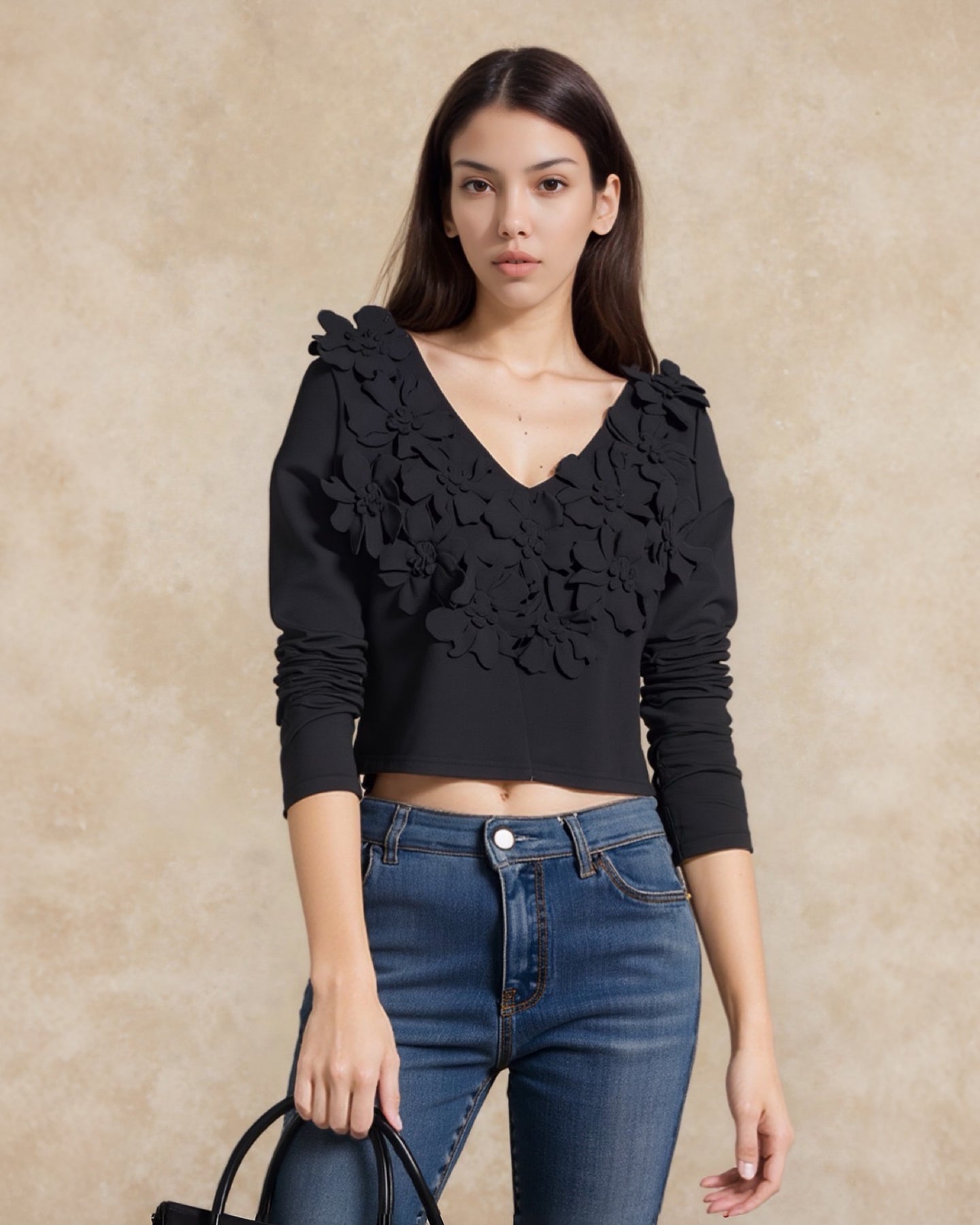 Confeccionado en un suave tejido negro con stretch, este top destaca por su escote en V y sus espectaculares aplicaciones florales 3D, creando una textura tipo alta costura que luce sofisticada y moderna.