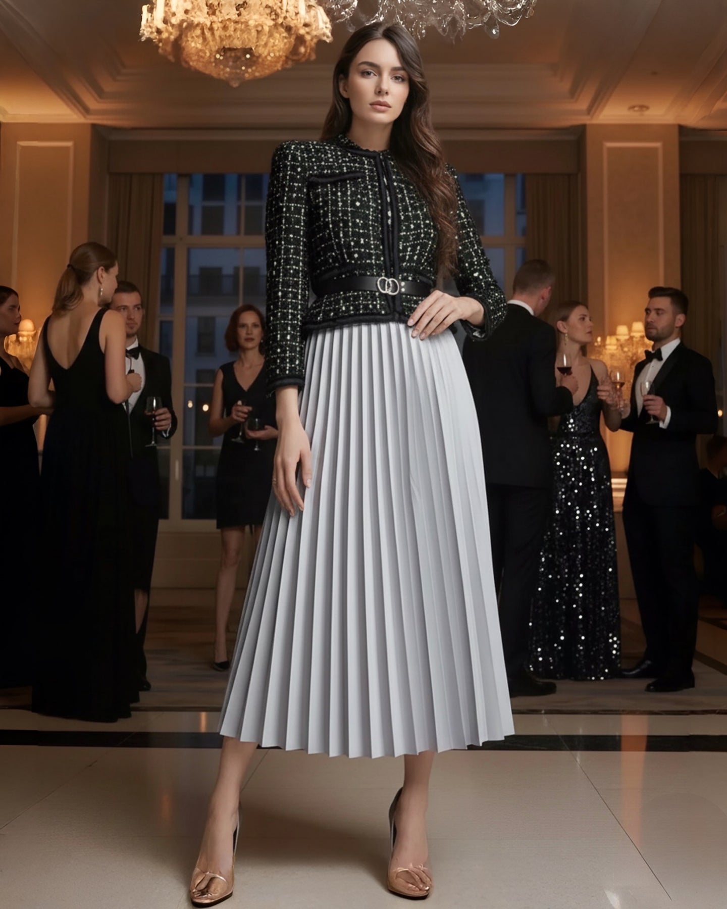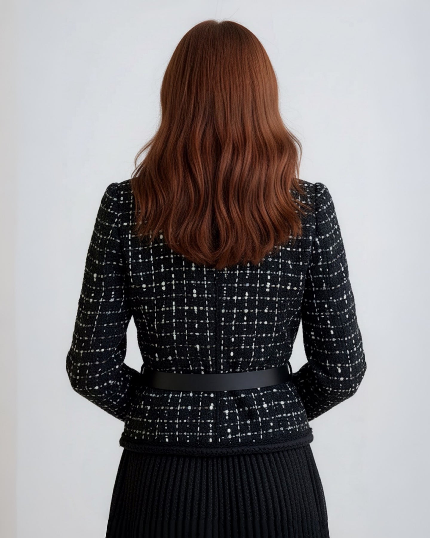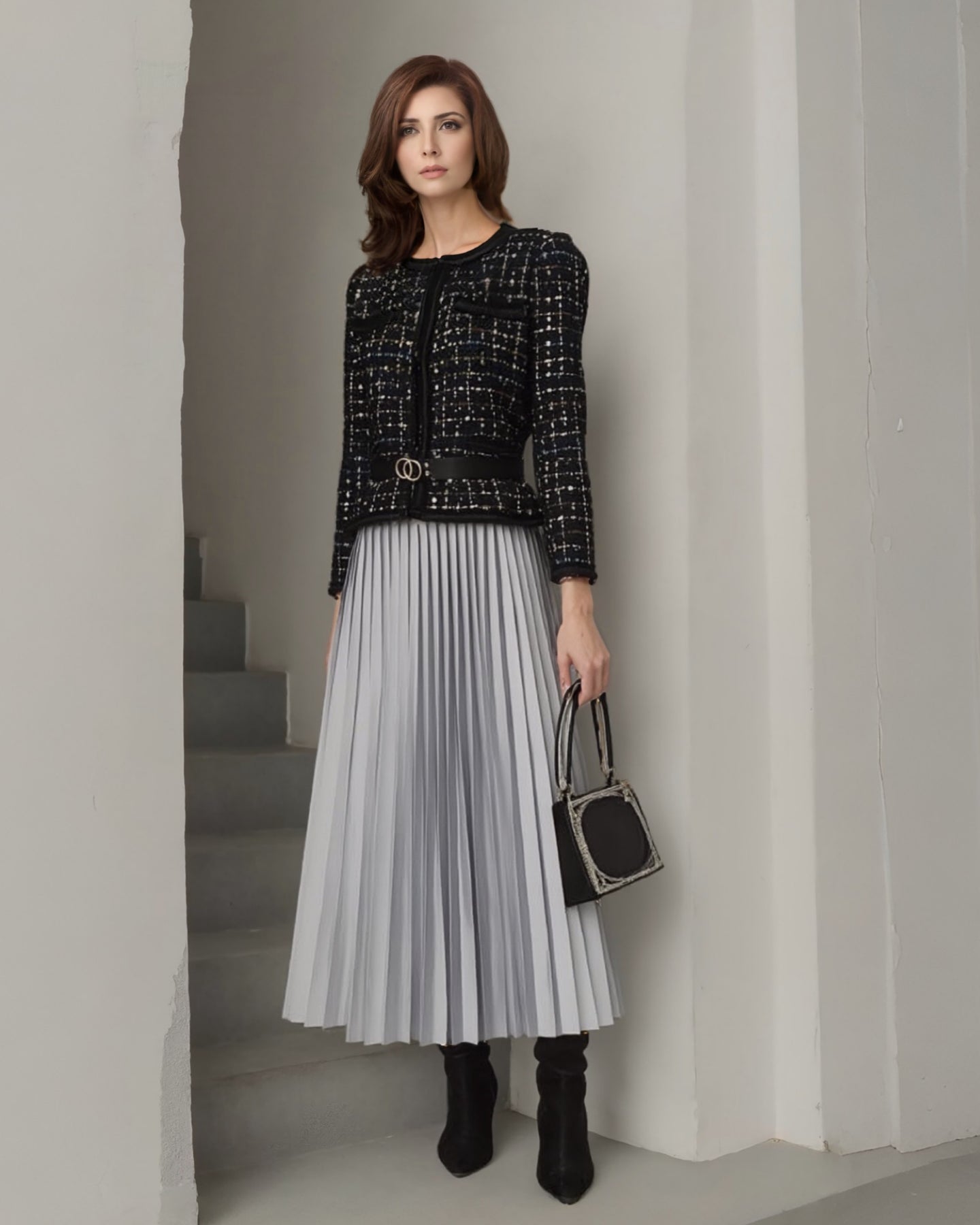 Póntela sobre un vestido neutro para resaltar la textura del tweed. Finaliza con accesorios minimalistas.